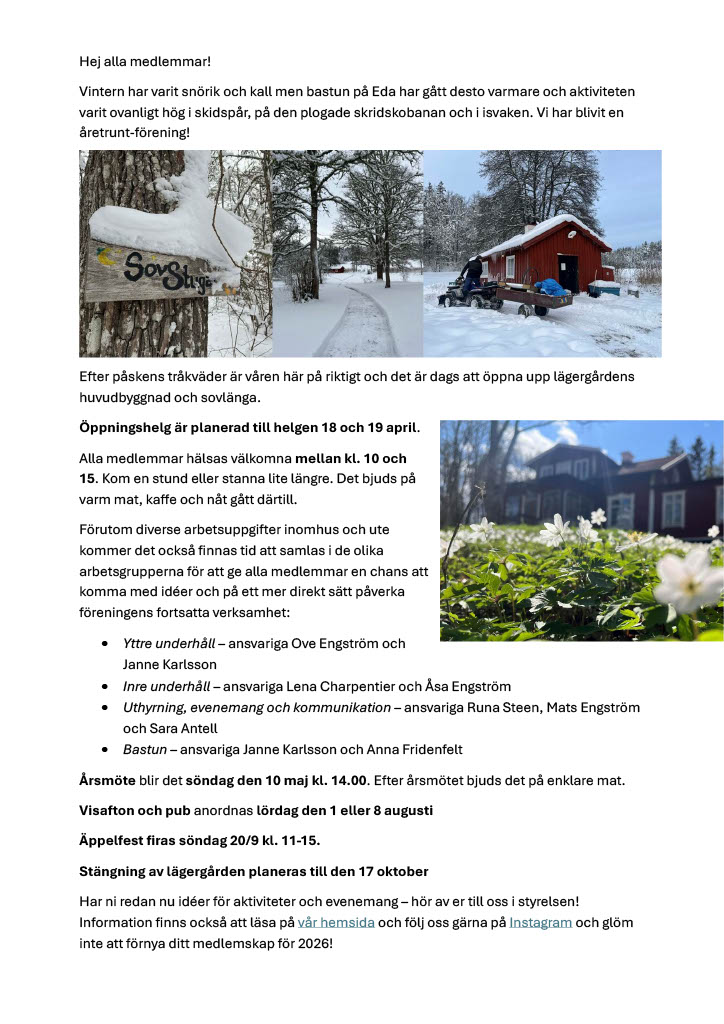Hem Öppningshelg 18-19 April Sommaraktiviteter Eda Lägergård 2025 Senaste inläggen: Äppelfest 2025 Nedladdningsbar kopia av programmet Äppelfest 2025 Öppningshelg på Eda Lägergård , 18 -19 AprilSommaraktiviteter Eda Lägergård 2025Senaste NyttÅrsmöte och Öppet hus 14 majÄppelfest 2022!MedlemsmöteÅrsmöteVåröppningHöststängningHöstfix